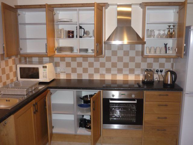 Kitchen has washing machine, large fridge freezer, microwave, kettle, breakfast bar with bar stools. Kitchen has plates, glasses, pots, pans, cutlery...