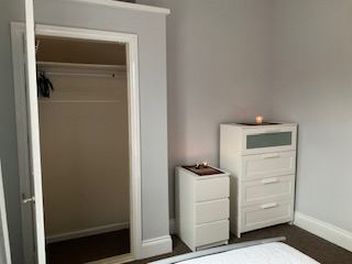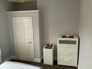 This spacious bright bedroom includes a comfortable double bed with 2 sets of drawers Also included is a large walk in wardrobe