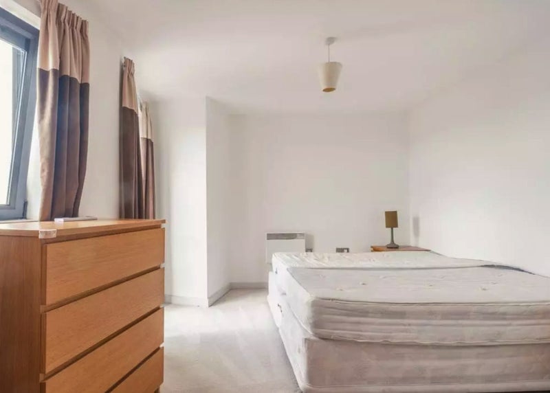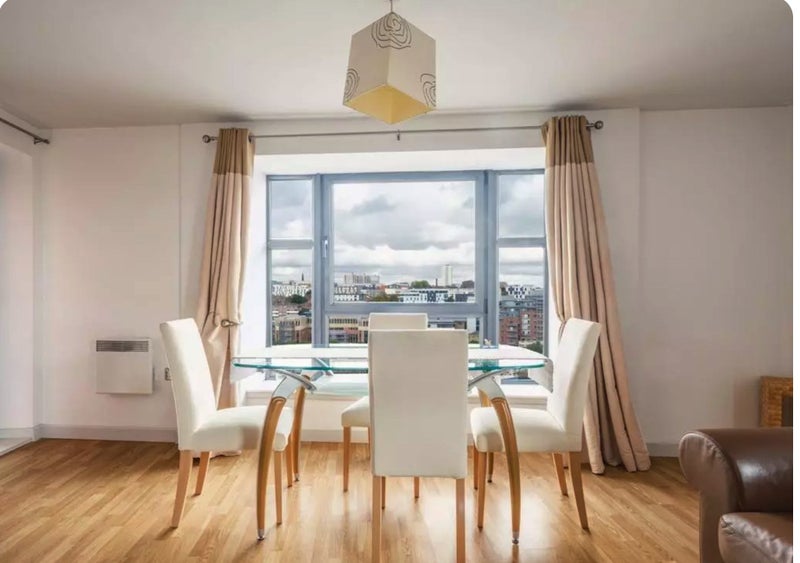 A bright and spacious Super king-size bedroom with private bathroom available in a modern 2-bedroom apartment in Baltic Quay. The flat offers stunning views of the River Tyne, iconic bridges, and Newcastle skyline, along with a balcony and open-plan living space.