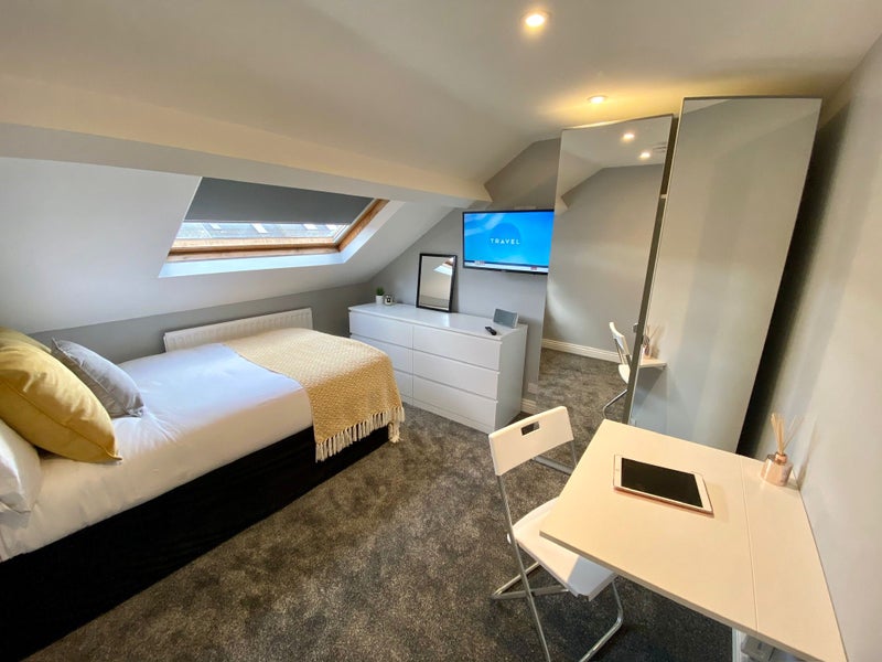 SMART Samsung TV (Netflix etc enabled) extra large PAX mirrored wardrobe and large 6 drawer chest. The wall-mounted fold-away desk has been removed but could be reinstated if required.