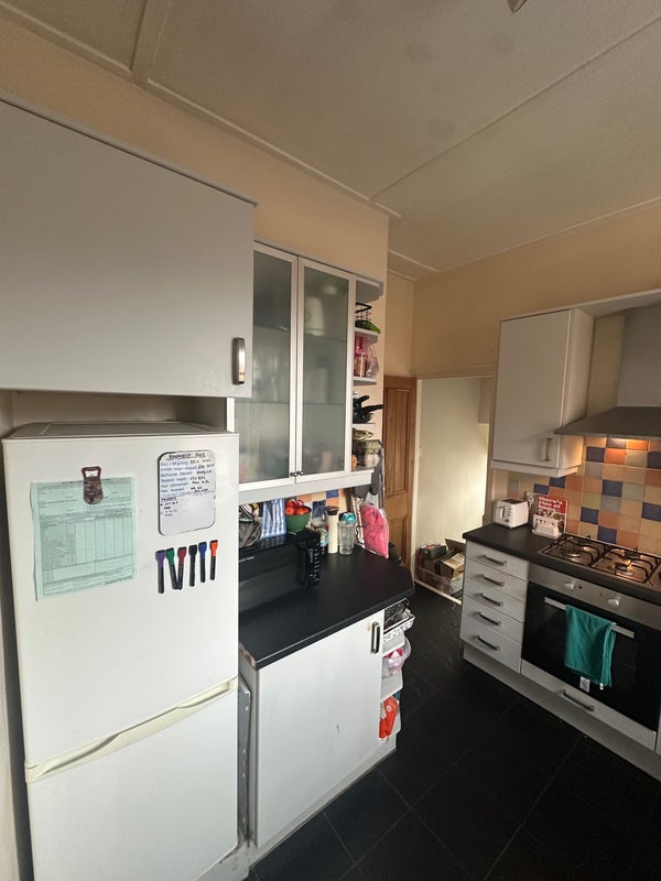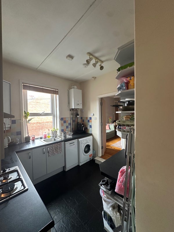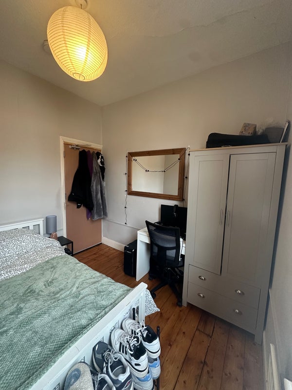 The bedroom is fully furnished with a double bed, wardrobe, shelving unit, desk, and a chair (not the one photographed). Wooden flooring and large window. Shared kitchen and bathroom with the two other tenants. Bathroom includes a shower over bath. Kitchen includes a dishwasher, washing machine, lots of storage spaces, electric oven and gas hob.