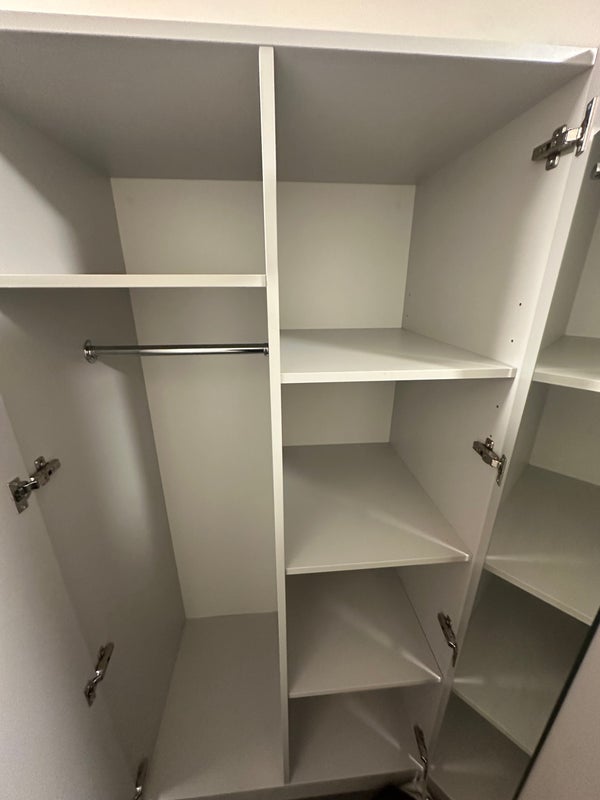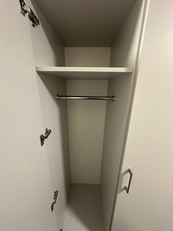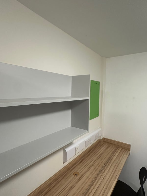 The room has a double bed , lots of shelf space and a communal living room with lots of space. It also has communal areas downstairs including pool tables and a laundry room.