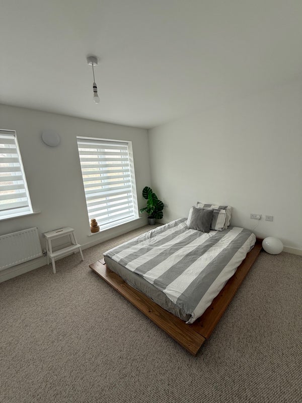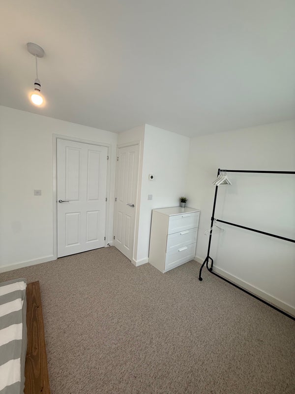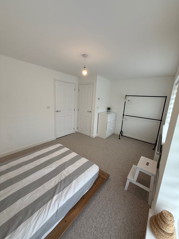 Double attic bed, large chest of drawers, double clothes rail, large cupboard for storage.