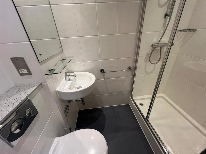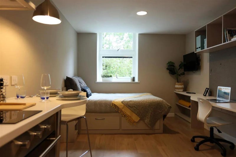 The studio features a fully equipped galley kitchen with an oven, electric hob, extractor fan, and fridge/freezer. It also includes an en-suite shower room, a dedicated desk space ideal for working from home or studying, and smart storage solutions designed for efficient studio living.