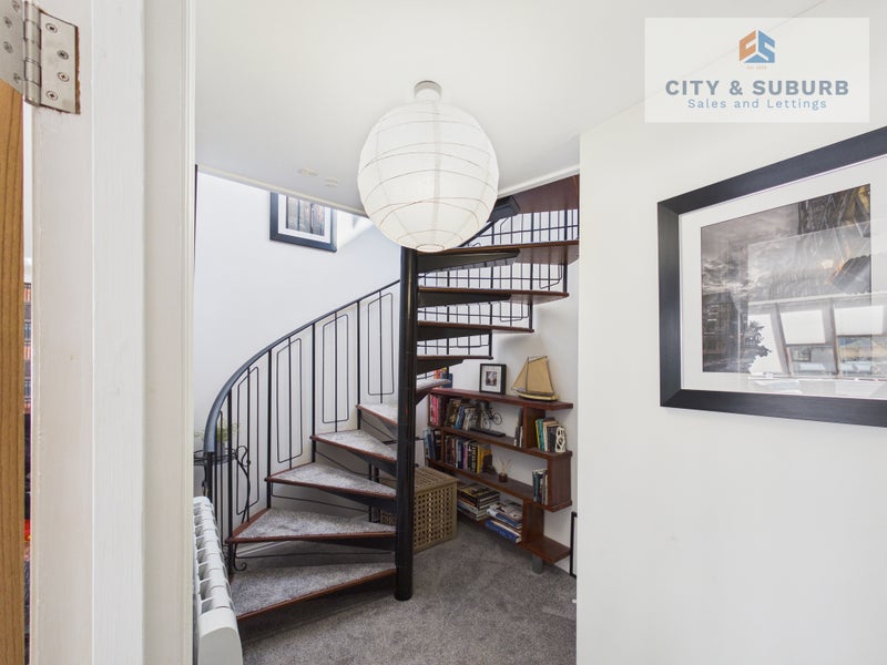 tunning two-bedroom duplex apartment located on the Newcastle Quayside. The property is set over two floors with a spacious open-plan living and kitchen area, large windows with plenty of natural light, and a unique spiral staircase leading to two double bedrooms and a modern bathroom.
