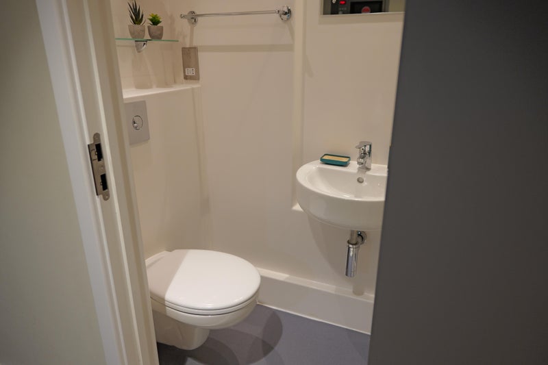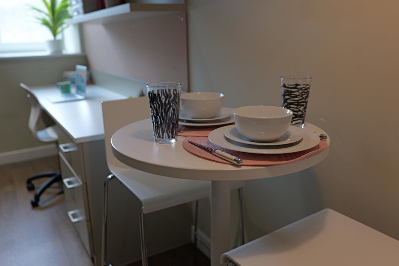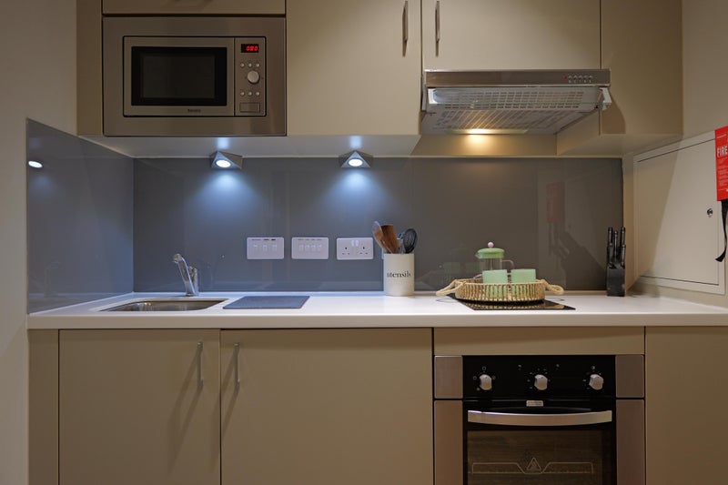 The studio features a well-designed galley-style kitchen equipped with an oven, electric hob, extractor hood, microwave, and fridge/freezer. There is a private en-suite shower room, dedicated desk space suitable for home working or studying, and clever built-in storage designed to maximise the studio layout.