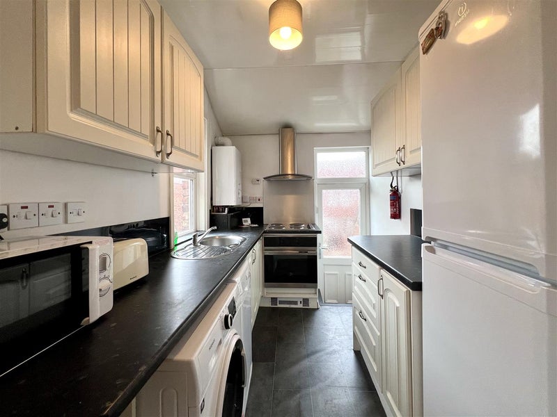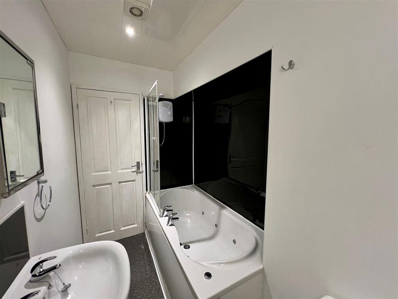 The flat features a spacious shared lounge complete with two fabric sofas, a dining area, and a wall-mounted LCD TV, creating a warm and social living environment. To the rear, you'll find a fully fitted kitchen equipped with all essential appliances. The modern shared bathroom includes a Jacuzzi-style bath with a mains shower. The property benefits from laminate flooring and UPVC double glazing throughout.