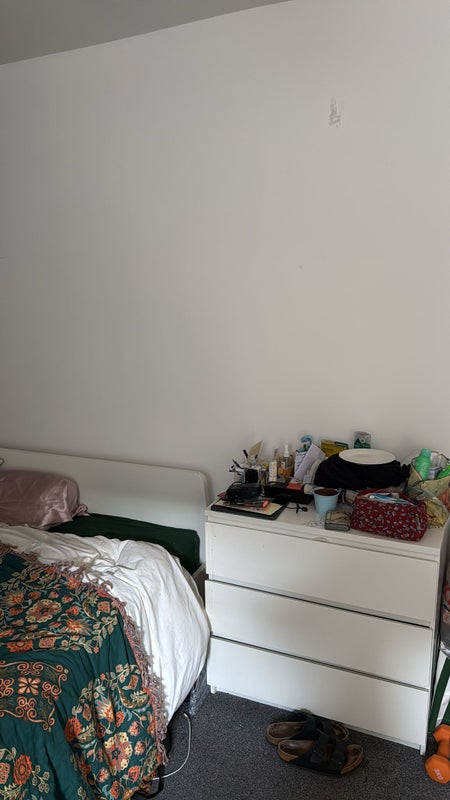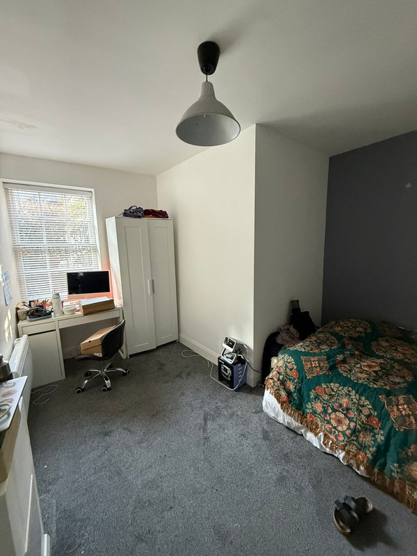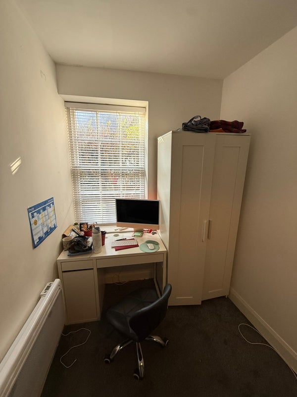 The room is very large with a table and a desk next to a nice window :) Lots of storage space included: a wardrobe and drawers, with plenty of room for extra if needed. Full-length mirror as well. Electric heater also in the room.