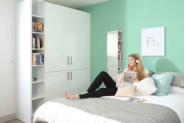 Contemporary room within a shared apartment, double bed (4ft 6), white gloss wardrobe and shelving, desk and chair and an en-suite shower pod.