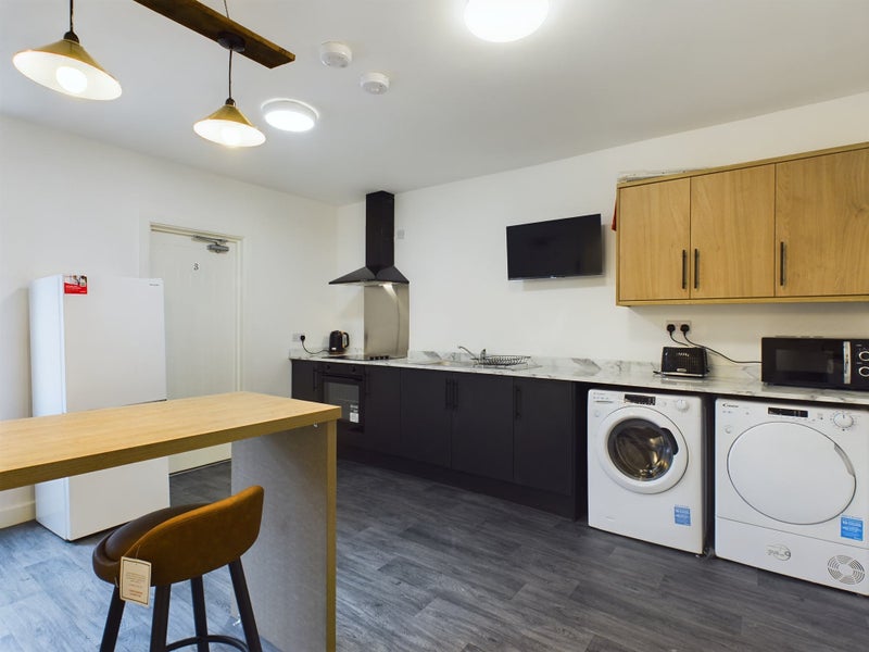 The property offers a well-equipped communal kitchen with all appliances included, along with a stylish dining area featuring a breakfast bar and TV. A washing machine and tumble dryer are also provided for residents’ use.