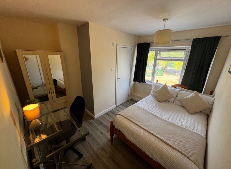 Double bed, wardrobe, desk, chair, storage drawers, Lamp, rug and pictures, shared bathroom