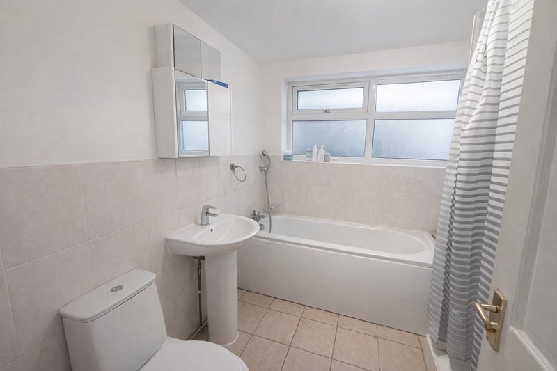 Bright fully furnished room in a home with bed, wardrobes, desks and chair. Shared kitchen, washroom and living/dining area. Modern bathroom with bathtub, shower, sink and storage. Spacious kitchen with appliances and good storage. Comfortable shared living space with sofa, chairs and tables for relaxing or eating.