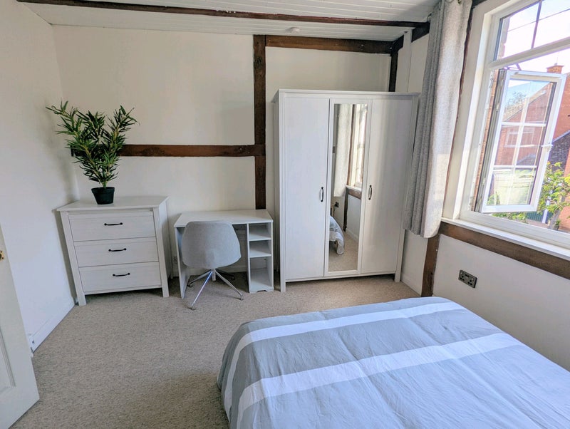 All bills included and good furniture provided: Brand new carpet (since photos), double bed, side tables with touch control lamps, plenty of usb outlets, desk, chest of drawers, and wardrobe.