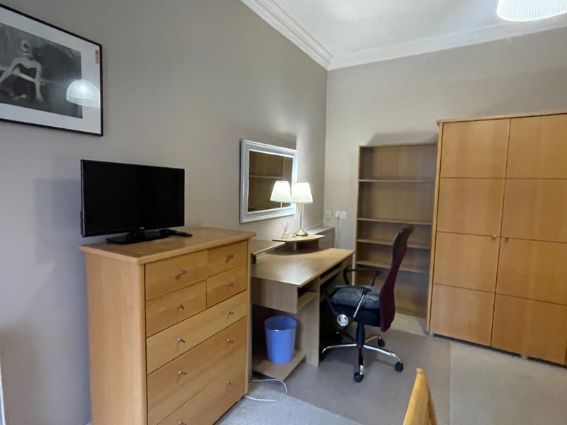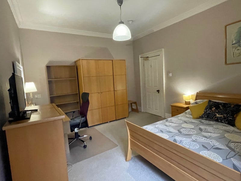 This is a large well furnished room with a double bed with a high quality pocket sprung mattress, fresh bed linen and towels, chest of drawers, desk with chair and television, and benefits from a large wardrobe with hanging rail and shelves.