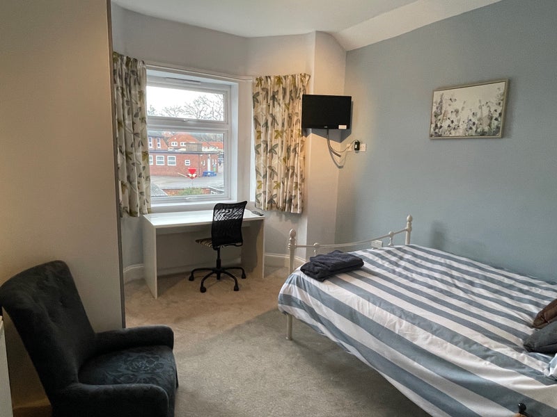 This lovely room benefits from its own private en-suite shower room with toilet, basin, shower cubicle and heated towel rail. The room benefits from a double bed with a quality pocket sprung mattress, along with fresh bed linen and towels. There is a large Ikea wardrobe with integral drawers and a study desk and chair. The room is lockable with a key on the exterior and a turn knob inside.