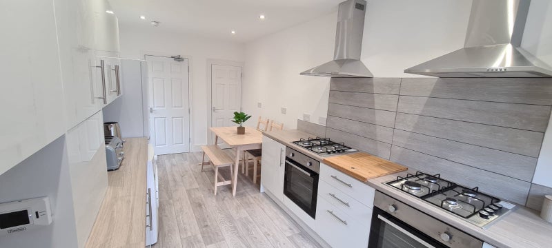 Shared kitchen with all the appliances (2 fridge freezers, 2 washing machines, kettle, toaster, microwave), dining table.