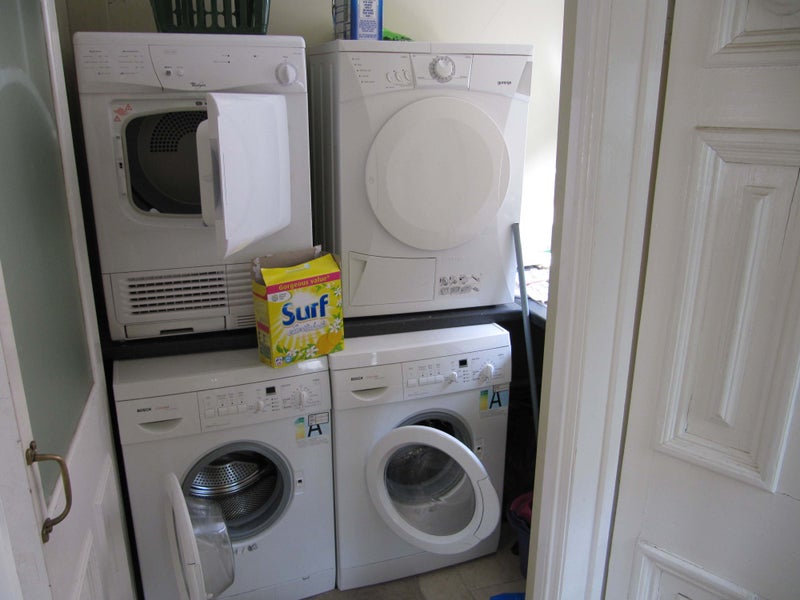 The kitchen has two fridges, microwave, two washing machines and two dryers, ample storage cupboards.