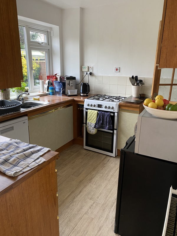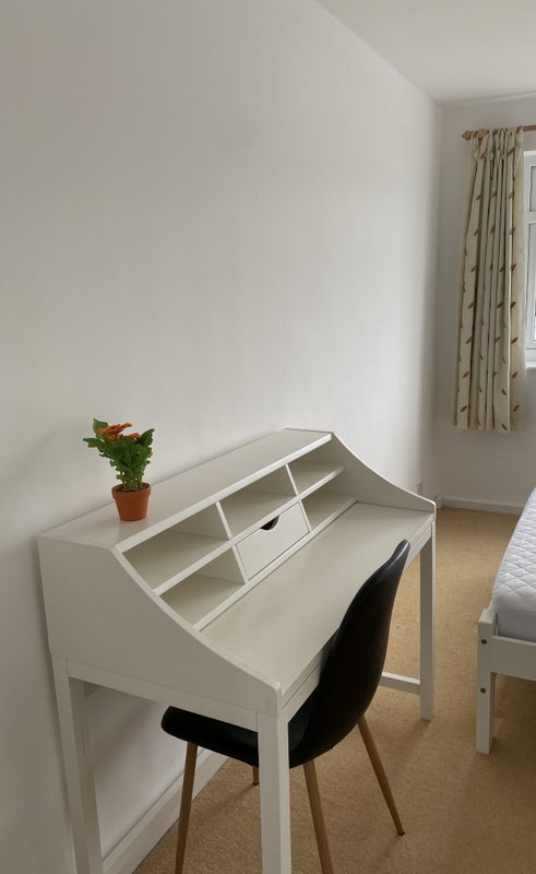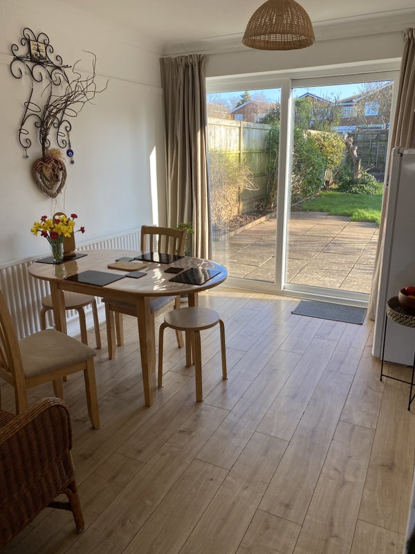 Bright double room in a three-bed detached house in a quiet neighbourhood. Room is fully furnished. Parking available on drive. Dining room, kitchen, bathroom and another downstairs toilet, garden and garage is currently shared by myself and another housemate