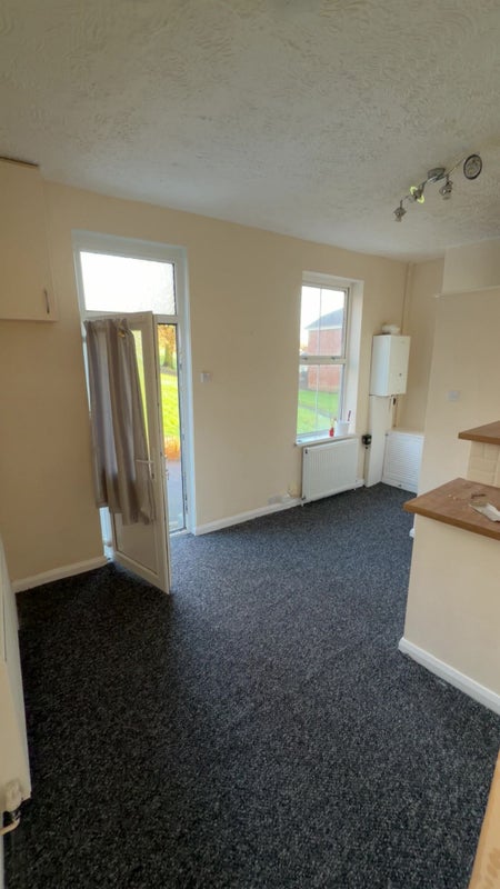 LIVING ROOM: 15’04 (max) / 14’04 x 10’11(max) / 9’03 – UPVC window and door to front, three radiators to the wall, combi boiler to the wall.