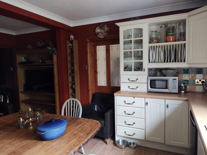 The downstairs kitchen is big, fully equipped, with plenty of cupboards for both lodgers to have their own, an excellent rangemaster cooker and a microwave, average sized fridge and freezer .
