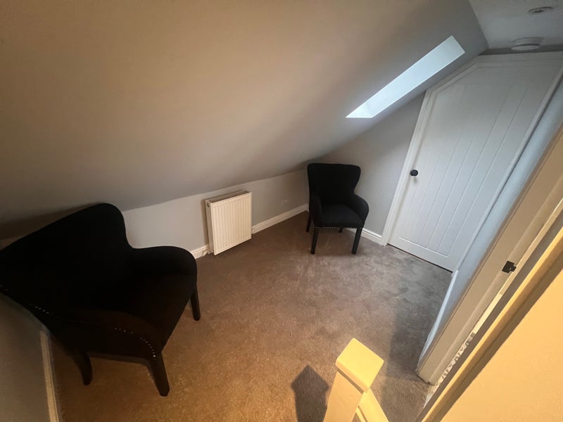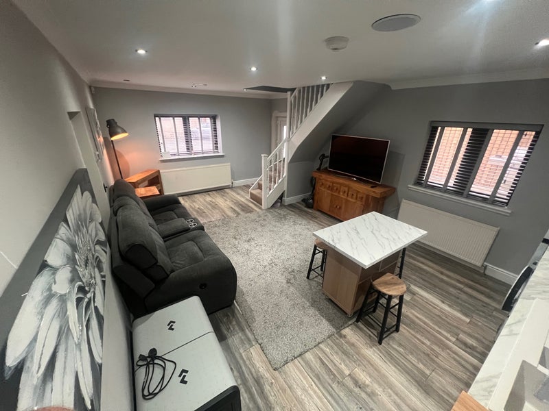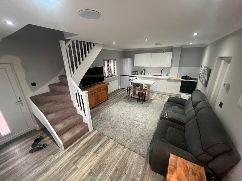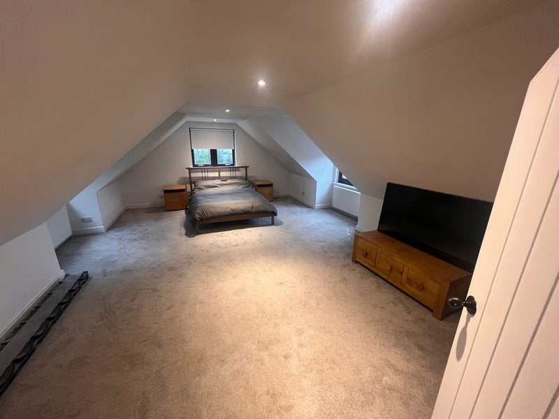 Upstairs there is a very large bedroom and a modern walk-in shower room. Downstairs features an open-plan living room and kitchen, providing a comfortable and spacious living area.