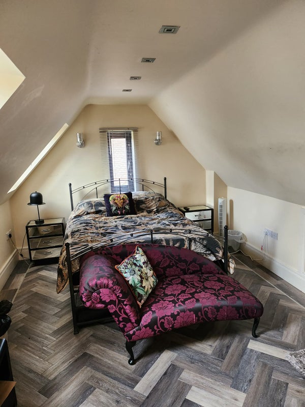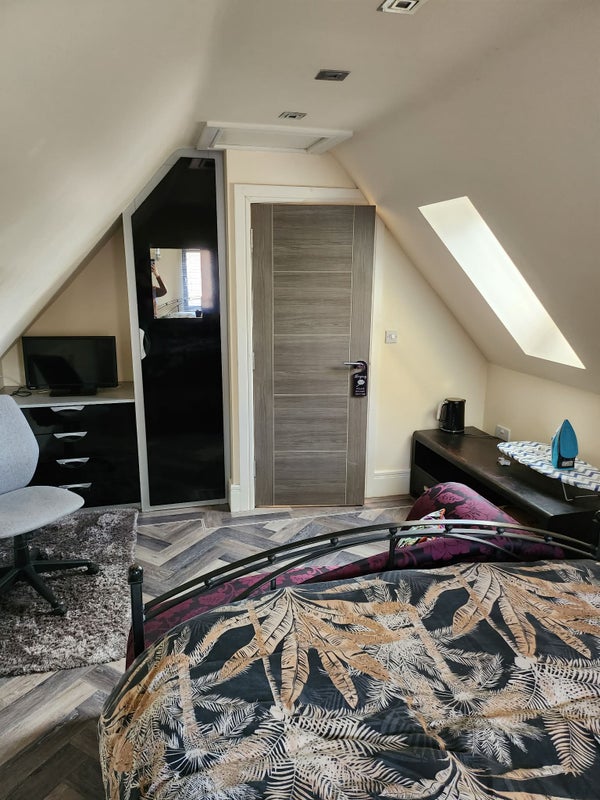 Spacious furnished king-size room with private bathroom, located on its own floor in a large 5-bedroom, 3-storey house. The property has a large shared driveway with your own parking space and access to a communal kitchen, garden and white goods.