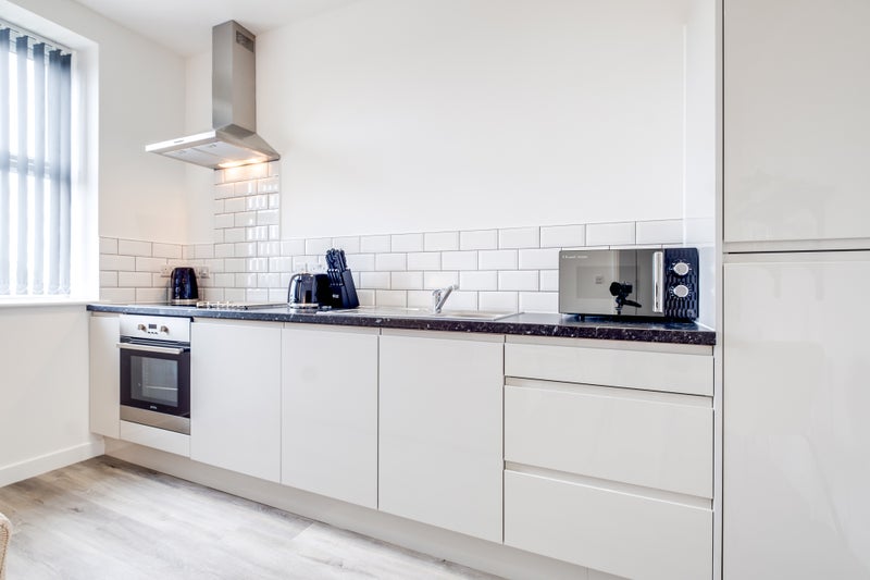 >Kitchen includes: electric cooker, oven, microwave, integrated Fridge/Freezer