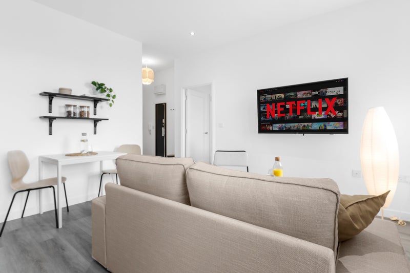 >55 inch Large TV mounted on wall in the lounge / kitchen area and 43 Inch in bedroom