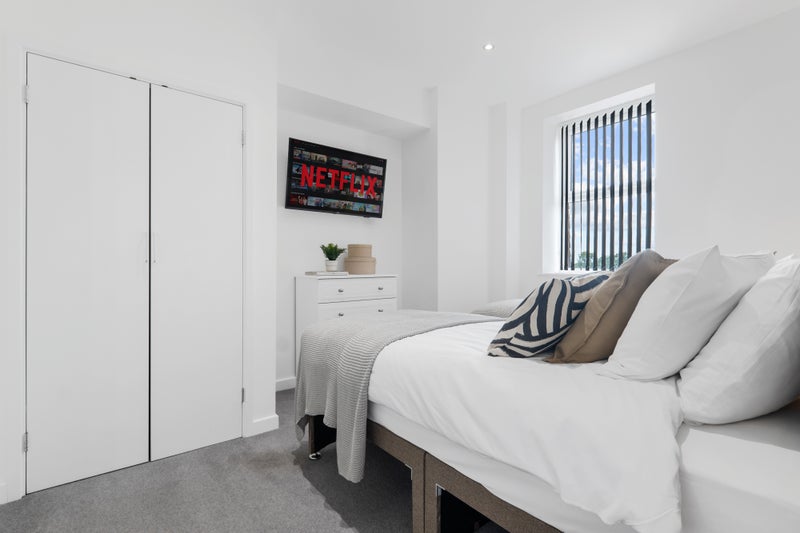 >Bedroom includes: bed with comfortable mattress, wardrobe, bedside table, chest of draws & TV