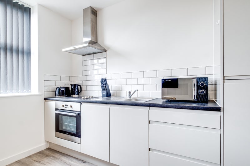 >Kitchen includes: electric cooker, oven, microwave, integrated Fridge/Freezer