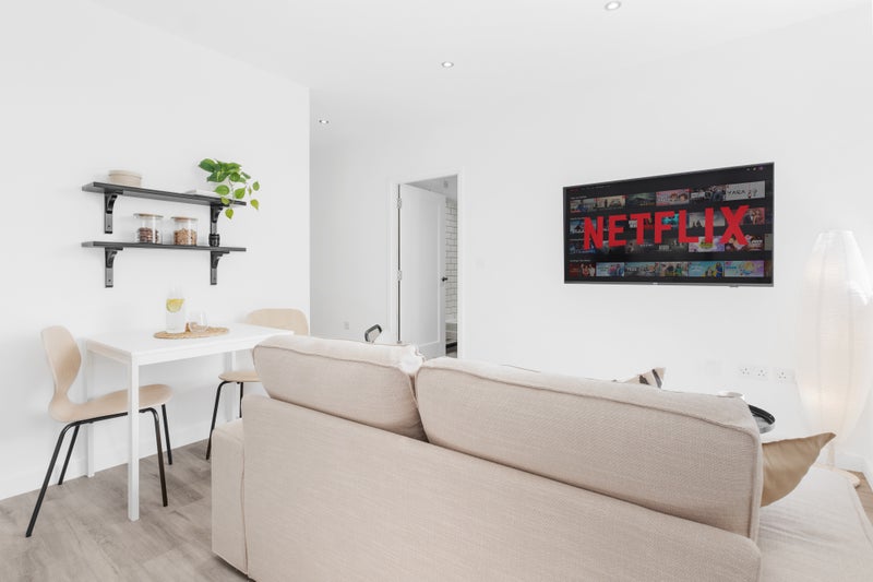>55 inch Large TV mounted on wall in the lounge / kitchen area and 43 Inch in bedroom