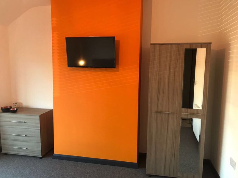 Modern furnished rooms with wooden blinds, stylish double beds, chest of drawers, bedside table and large mirrored wardrobe. Each room has a wall mounted 32’ flatscreen Panasonic tv with free view channels.