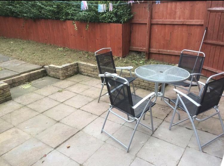 Back Garden: large paved patio area with a barbecue cooker and a set of garden furniture( table and chairs), washing lines, clothing rack etc.