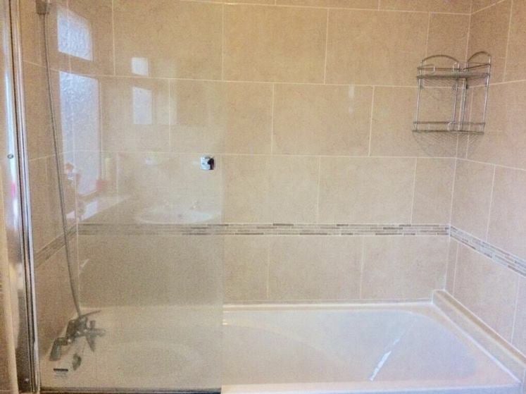Bathroom: bath tub with a shower above, glass panel, shower curtain, rack holder for bathroom accessories, washbasin with taps, toilet, toilet roll holder, wall mirror, towel ring, soap dish, toothbrush holder, hooks etc.