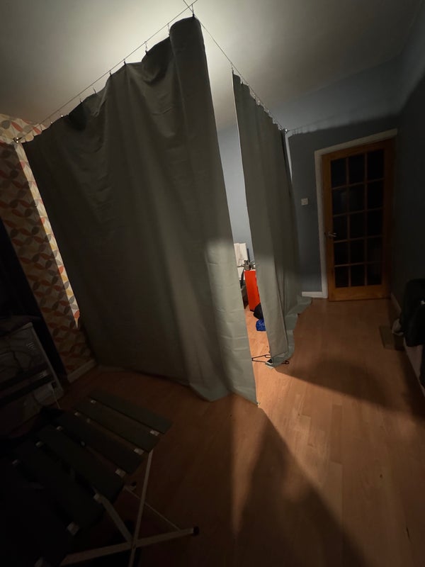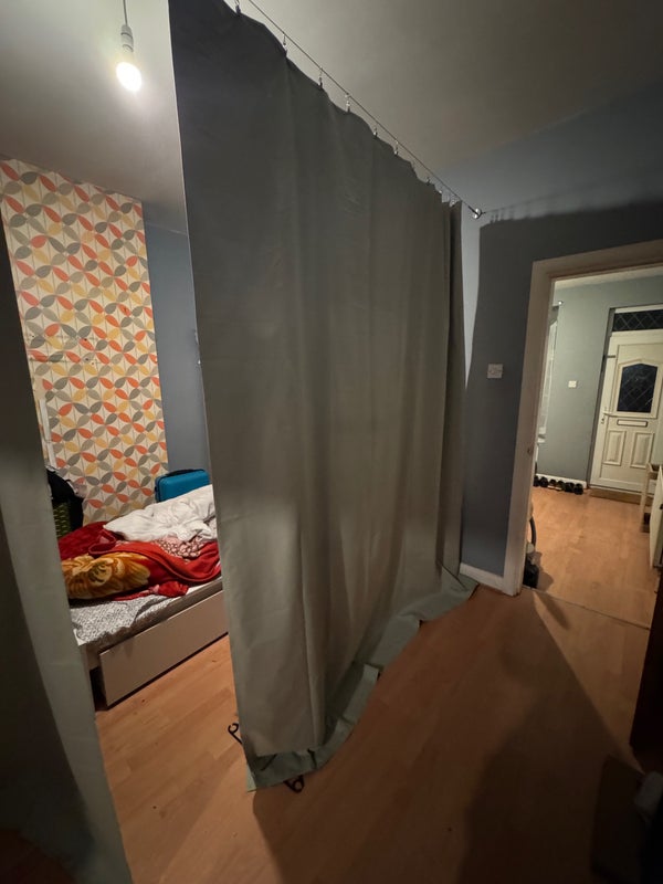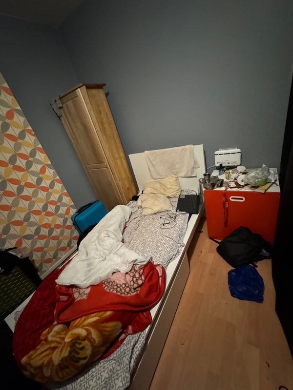 Open area with a single ikea bed, single wardrobe, and under-bed ikea storage. This is not a private room, covered by curtains as in pictures.