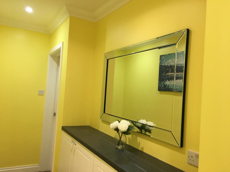 - shared bathroom is fully tiled and has a large wall mirror