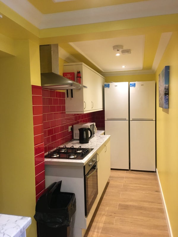 - open plan living room with fully equipped modern kitchen: hobs, electric oven, 2 large fridge freezers, washing machine, microwave and kettle