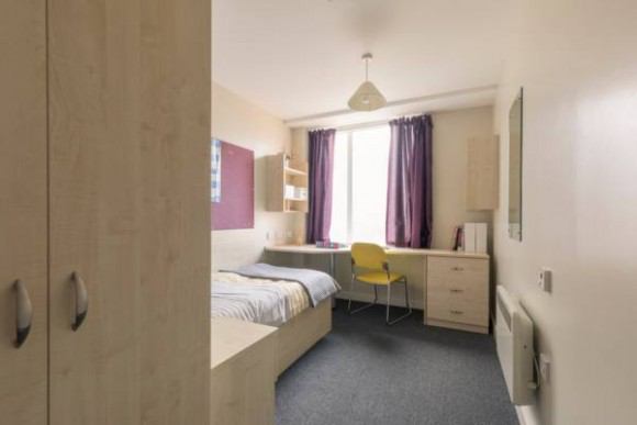 Feel at home in your en-suite room, which has a private shower room with sink and toilet, a comfortable three quarter bed with mattress and cover and a Wi-Fi connected study area with a desk, chair and a notice board. As well as a mirror, waste paper bin and wardrobe, you'll find storage space under your bed with shelves and drawers to store your belongings. Your shared fitted kitchen which includes a cooker, fridge/freezer, microwave, iron, ironing board, vacuum cleaner, kettle and toaster also has a living area which is an ideal space to relax with your flatmates.