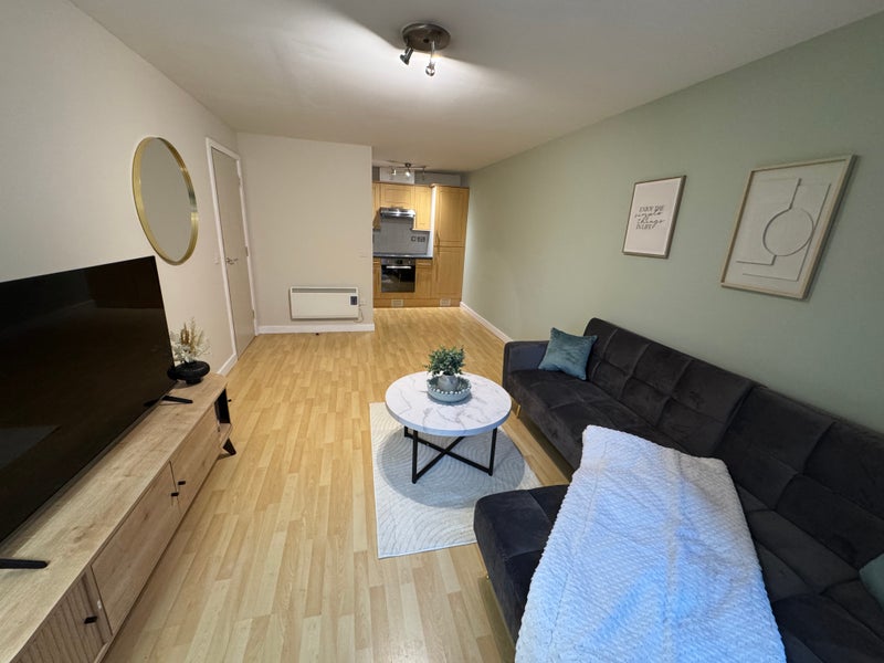 The apartment features a bright open-plan living space, a fitted kitchen with integrated appliances, and a spacious double bedroom with ample storage within a built-in wardrobe.