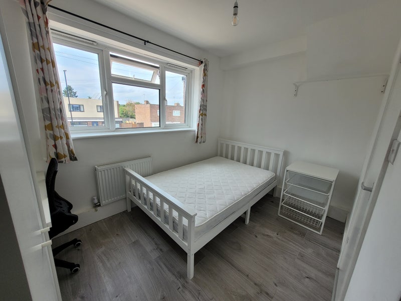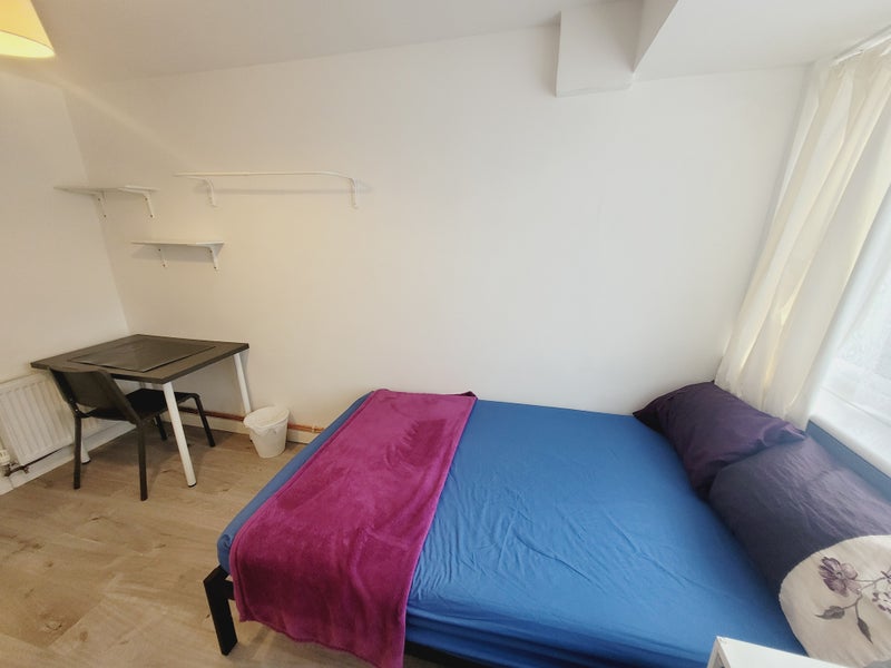 Fully furnished ensuit bedroom with doublebed, desk, chair and wardrobe