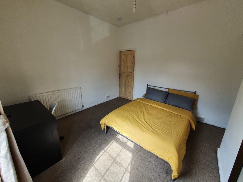 The house features three well‑appointed double bedrooms, each furnished with a bed, wardrobe, desk, and chair. One spacious double overlooks the front garden, another faces the rear garden, and a third is located on the ground floor with views to the front. The property benefits from central heating via an efficient new boiler.