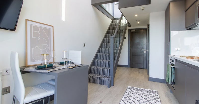 The Premium Mezzanine studio is split over two floors and comes complete a fully fitted kitchenette, stylish en-suite bathroom, a luxurious balcony, ample storage and panoramic views from the 10th floor. Each studio boasts a three quarter bed, large study desk and chair, a modern kitchenette and large windows to enjoy the view.