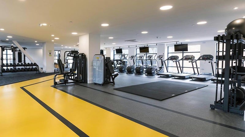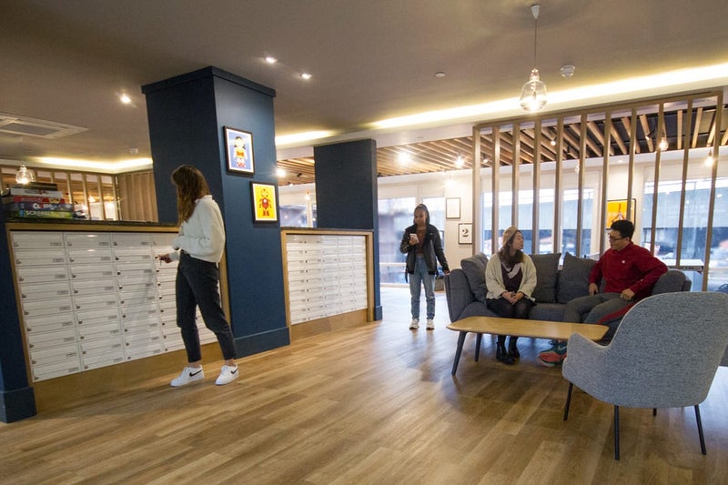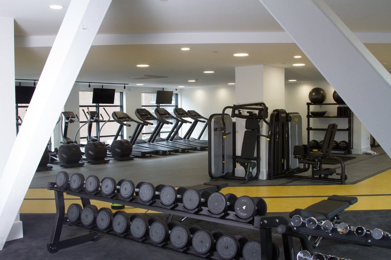 Modern building with communal spaces, gym, and laundry