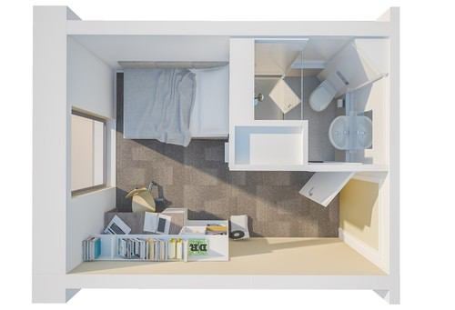 Each room is well equipped and contains: ¾ bed, desk, chair, wardrobe, shelving unit, modern shower room.