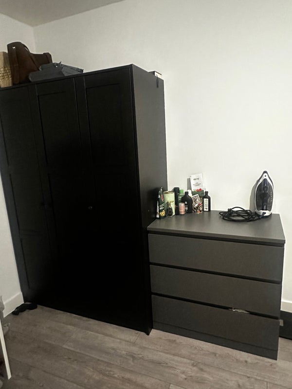 1. Fully furnished with a double bed, bedside table, chest of drawers, and wardrobe