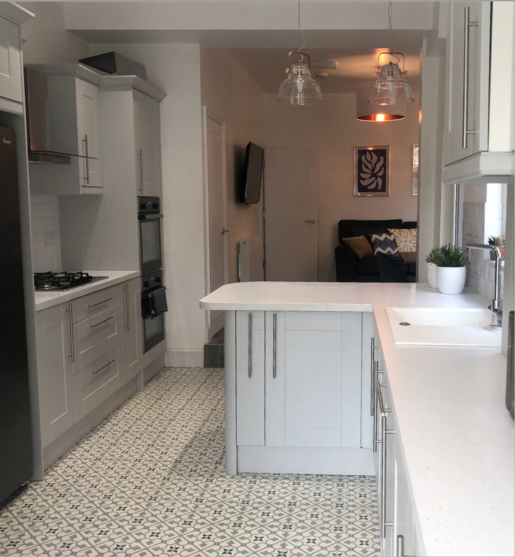 Beautiful Wren Kitchen with breakfast area, American style fridge/freezer, two ovens, dishwasher, washing machine, tumble dryer, microwave, toaster, kettle, plates, saucepans, cutlery, cooking utensils etc.