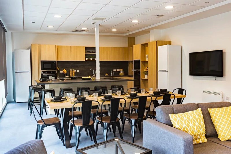 This bright, modern, large (up to 13.8m2) room comes with a ¾ double bed which incorporates a headboard with clever storage and charging points so you can charge your phone whilst in bed. Each room comes with a wardrobe, shelving, long desk with extended shelving, chair and has large windows which bring in a lot of natural light. It is also en-suite with a WC, shower, sink and accessories so no need to queue and argue about using the bathroom. In your flat is also a living area where there is a table, chairs, sofas, fully fitted sleek, modern kitchen and TV. A great place to hang out with your friends and flatmates. Available in clusters of 4, 6, 7, 8, 9 and 10.