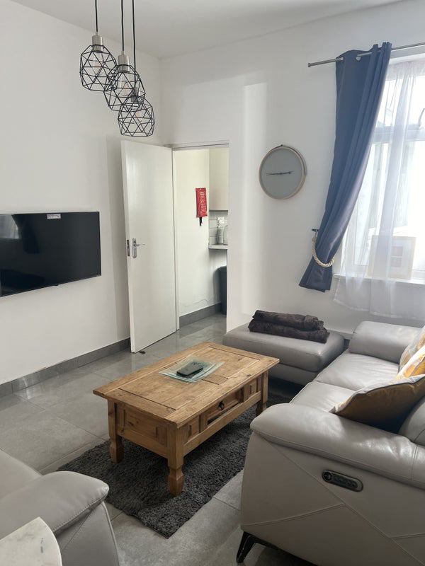 One bathroom, extra toilet, kitchen, outhouse laundry with washing machine and tumble dryer, living room.