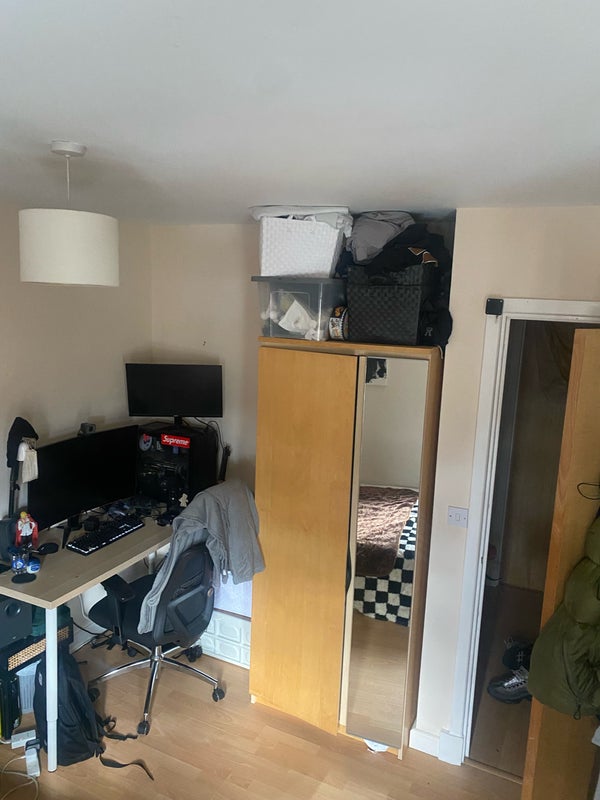 The room includes a double bed, large mirrored wardrobe and desk setup, making it perfect for both relaxing and working from home. The apartment benefits from separate bathrooms, providing added privacy and convenience.