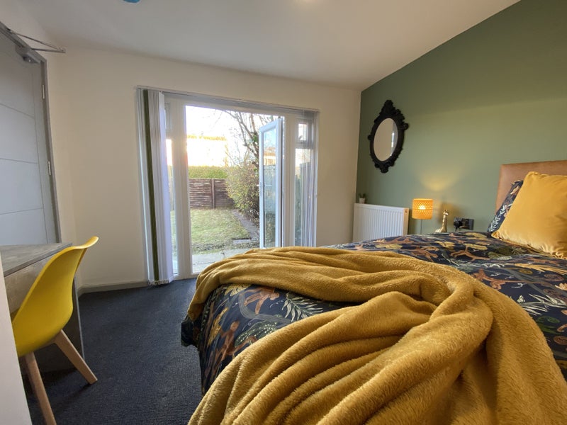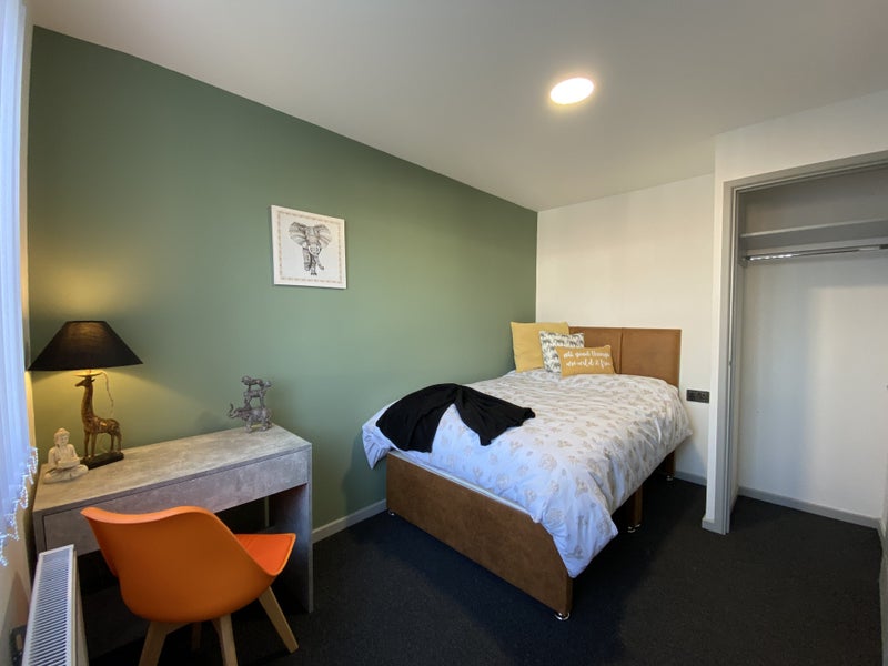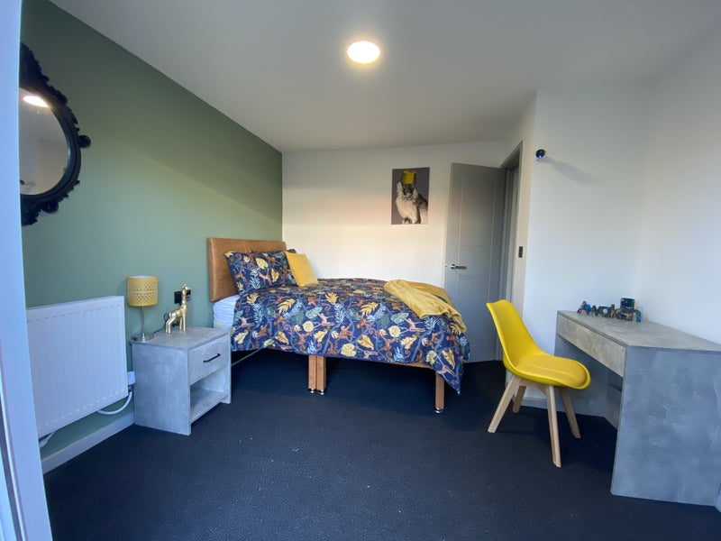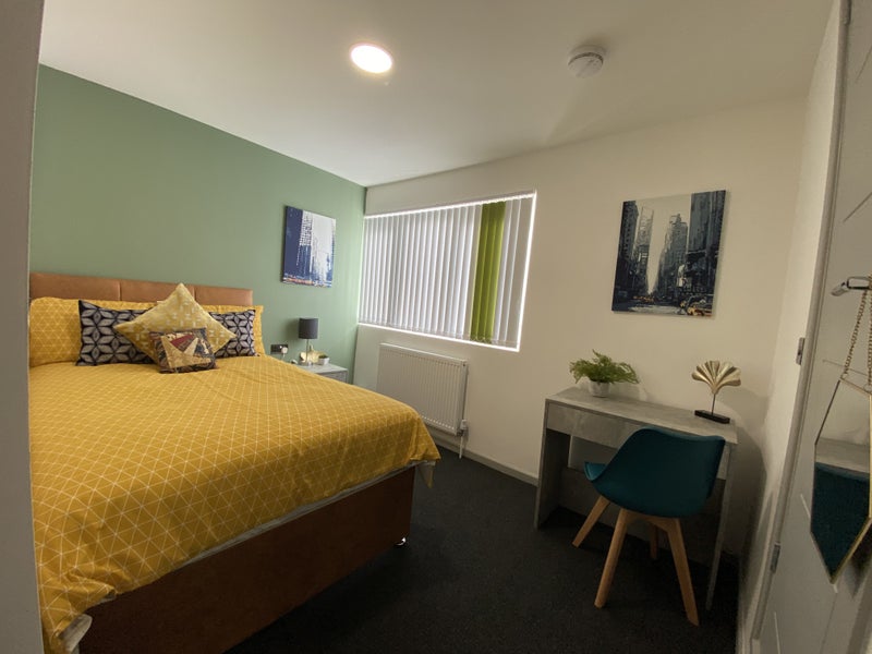 Full furnished double bedroom with brand new cut out bed (for extra storage underneath), mattress, walk-in wardrobe, desk and bedside table.